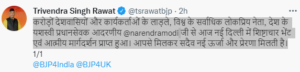 पूर्व मुख्यमंत्री त्रिवेंद्र सिंह रावत ने ट्वीट करते हुए कहा कि करोड़ों देशवासियों और कार्यकर्ताओं के लाड़ले, विश्व के सर्वाधिक लोकप्रिय नेता, देश के यशस्वी प्रधानसेवक प्रधानमंत्री नरेंद्र मोदी से आज नई दिल्ली में शिष्टाचार भेंट एवं आत्मीय मार्गदर्शन प्राप्त हुआ। आपसे मिलकर सदैव नई ऊर्जा और प्रेरणा मिलती है।