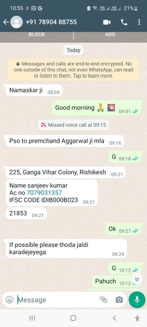 उत्तराखंड प्रदेश के वित्त और संसदीय कार्य मंत्री डॉ प्रेमचंद अग्रवाल के नाम से उनकी आवाज़ निकाल कर ठगी करने का प्रयास किया गया है। इस संबंध में पुलिस को तहरीर दी गयी है। वहीं व्हाट्सएप मैसेज के माध्यम से भी पैसों की डिमांड की गई है।