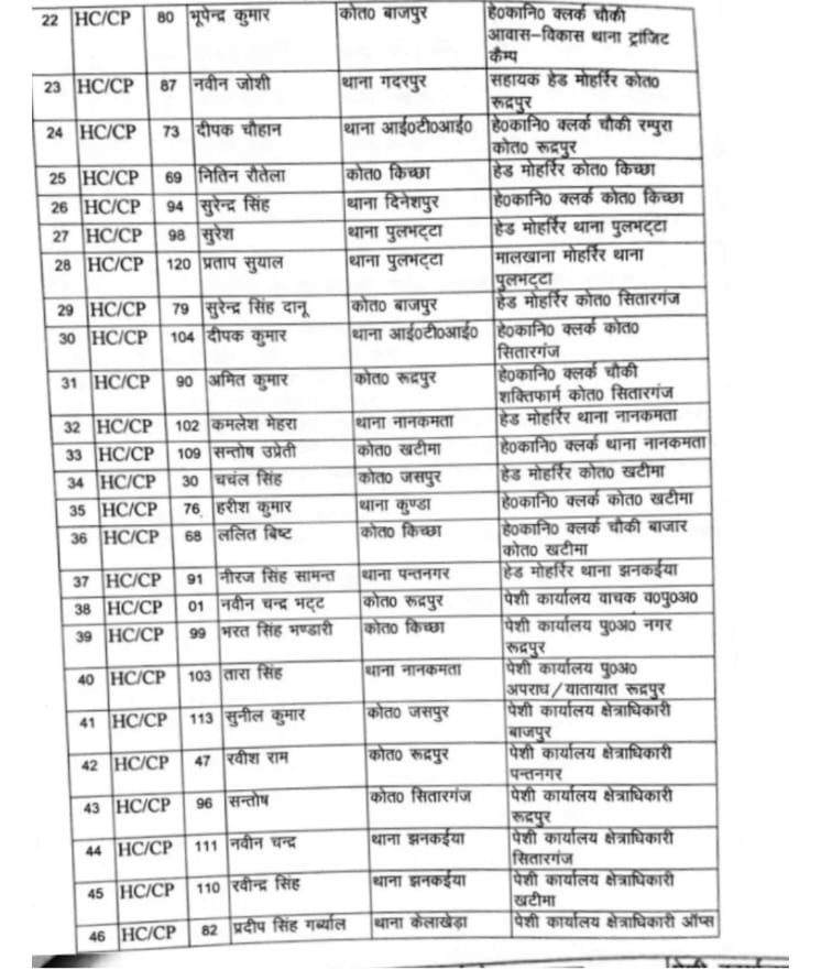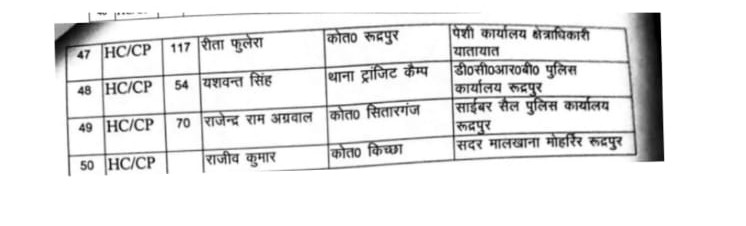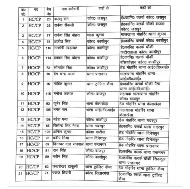 ऊधम सिंह नगर में एस एसपी मंजूनाथ टीसी ने देर रात जिले के विभिन्न थानों में 50 हेड कांस्टेबलो के तबादले कर दिए है।